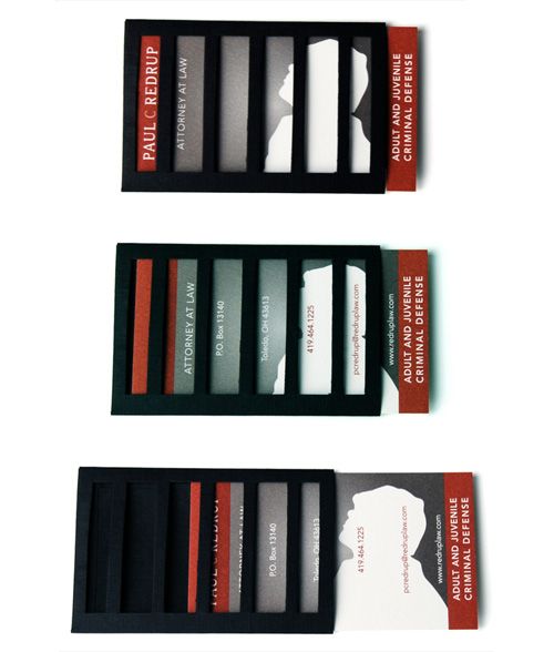 Paul Redrup, a local criminal defense lawyer, wanted a business card that instantly set him apart from the typical, bland cards that most lawyers carry. So we decided to create a card that was much more tactile and interactive in engaging the viewer, therefore leaving a more memorable impression. The concept is simple. The card itself shows a down-trodden figure stuck in jail. Then as you remove the card from the case, you release him, which in essence symbolizes the job of a criminal defense lawyer. The contact information is also revealed as the card slides out.